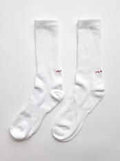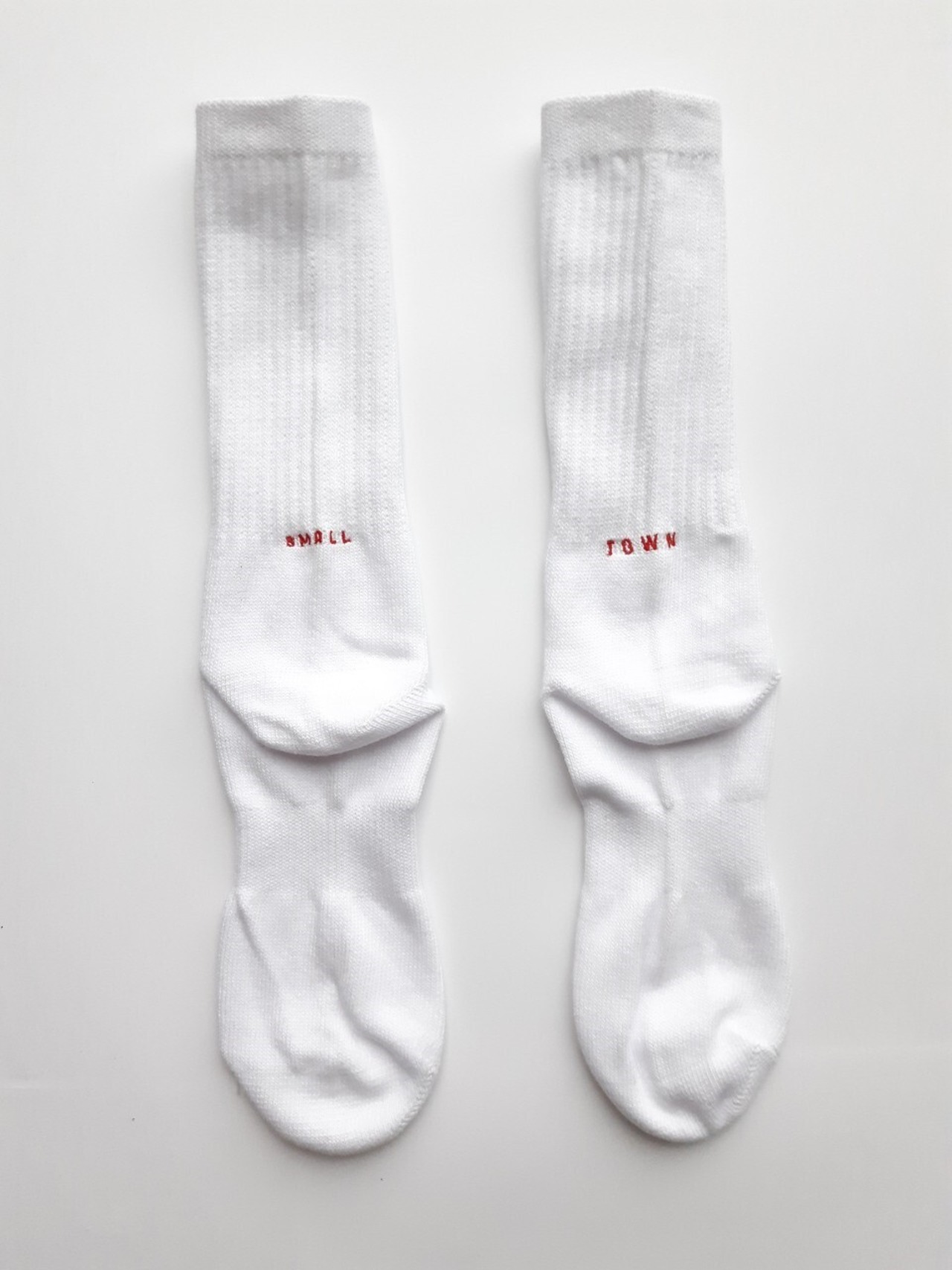 "SMALL TOWN" メンズ刺繍ソックス25~27cm(ホワイト×レッド)