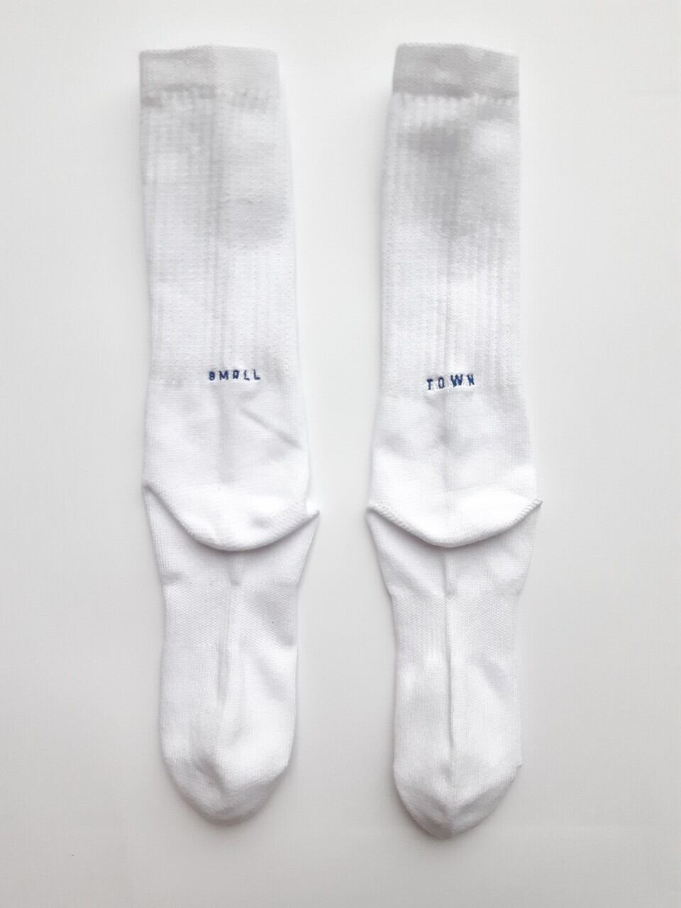 "SMALL TOWN" メンズ刺繍ソックス25~27cm(ホワイト×ブルー)